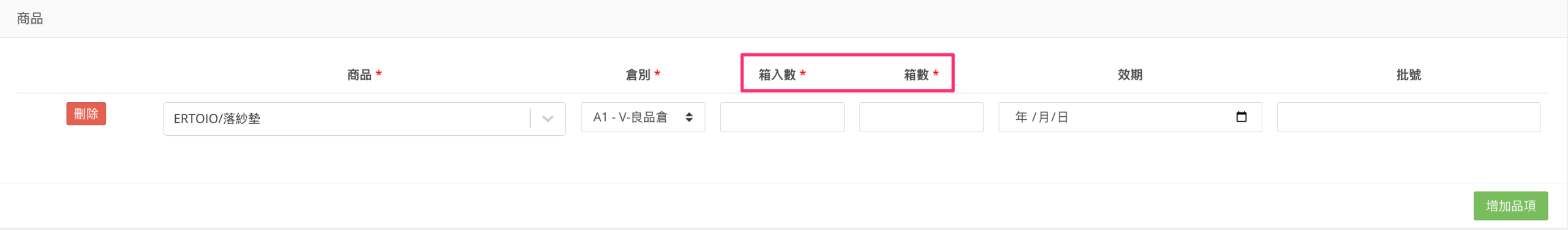 填寫商品的箱入數以及進倉箱數