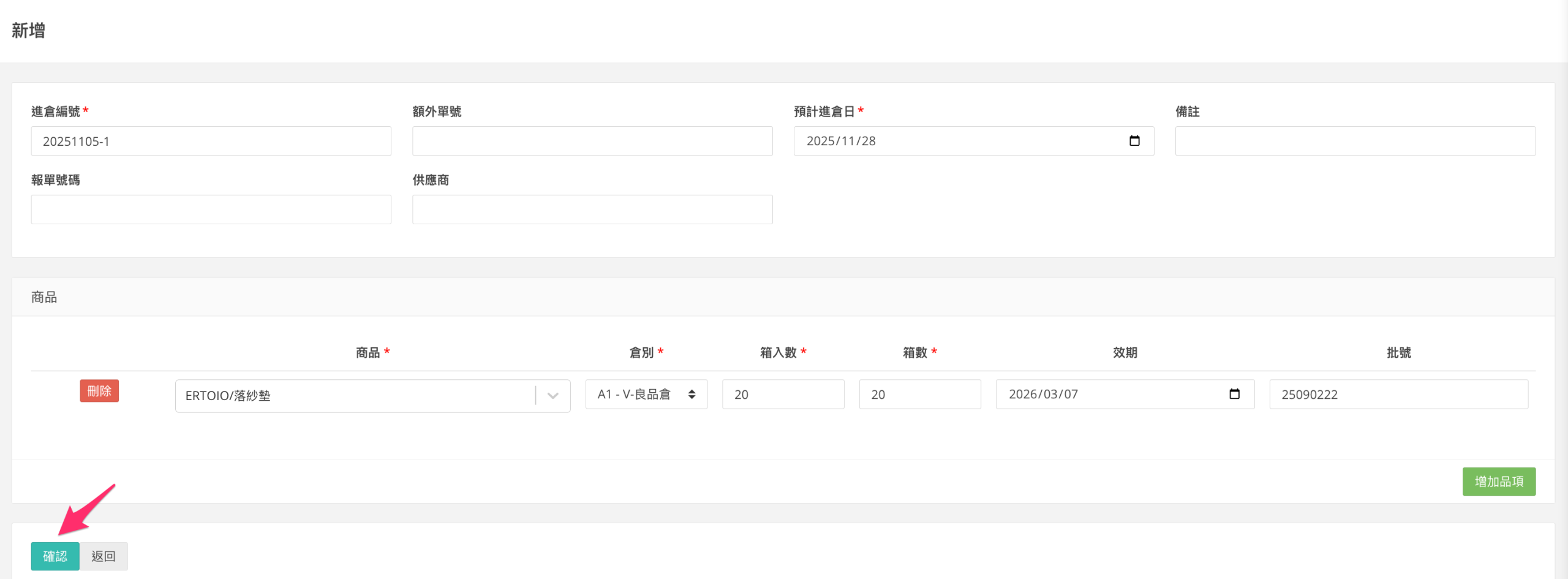 一、新增進倉單