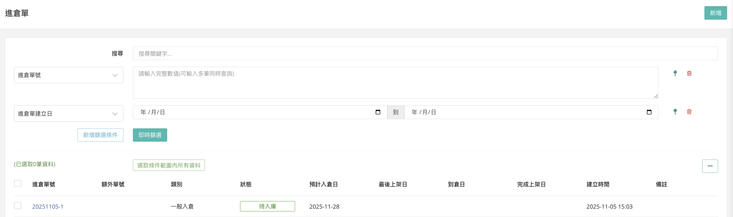 至 wms 後台「左側列表>進倉單>新增」新增進倉單