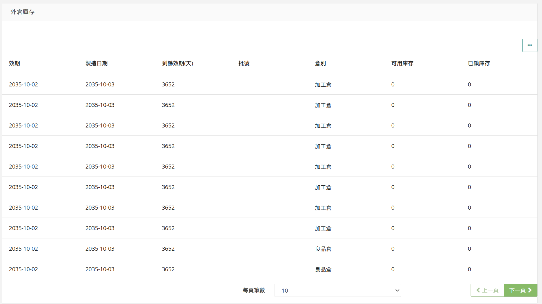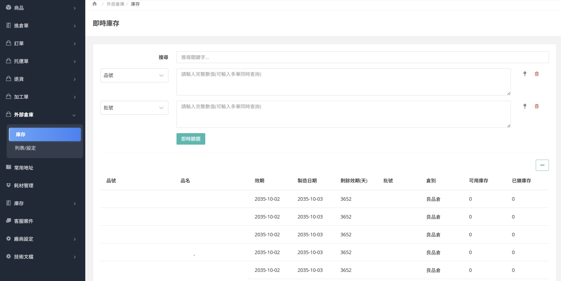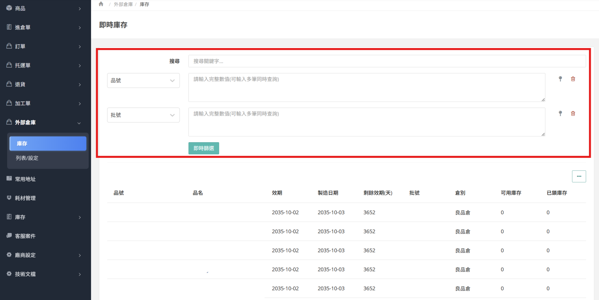 利用篩選「關鍵字」/「品號」/「批號」的方式查找商品在外部倉庫的庫存