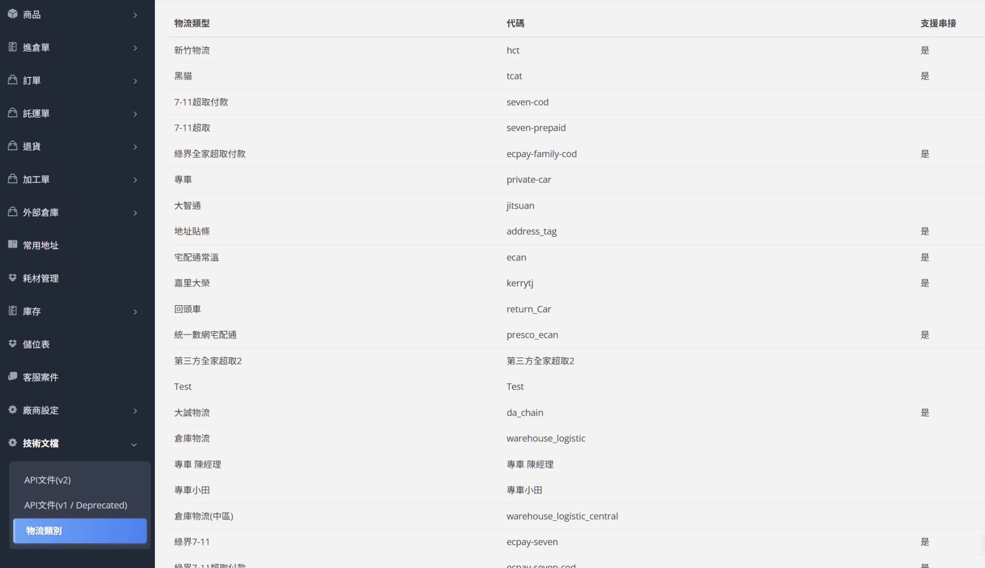 列表呈現目前系統可自動串接物流類型、物流代碼、是否支援串接