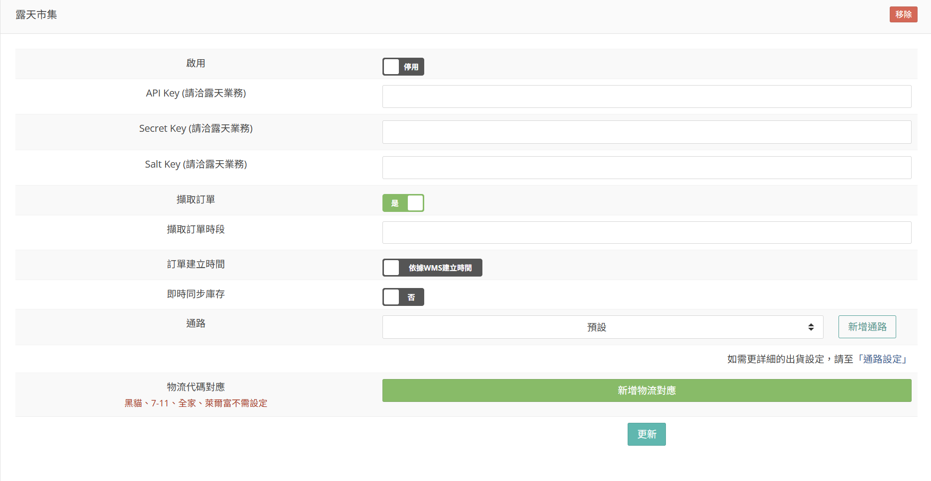 4、即時同步庫存:調整為「是」,系統將 WMS 通路設定中指定倉別的庫存同步至露天市集; 調整為「否」則不同步庫存至露天市集