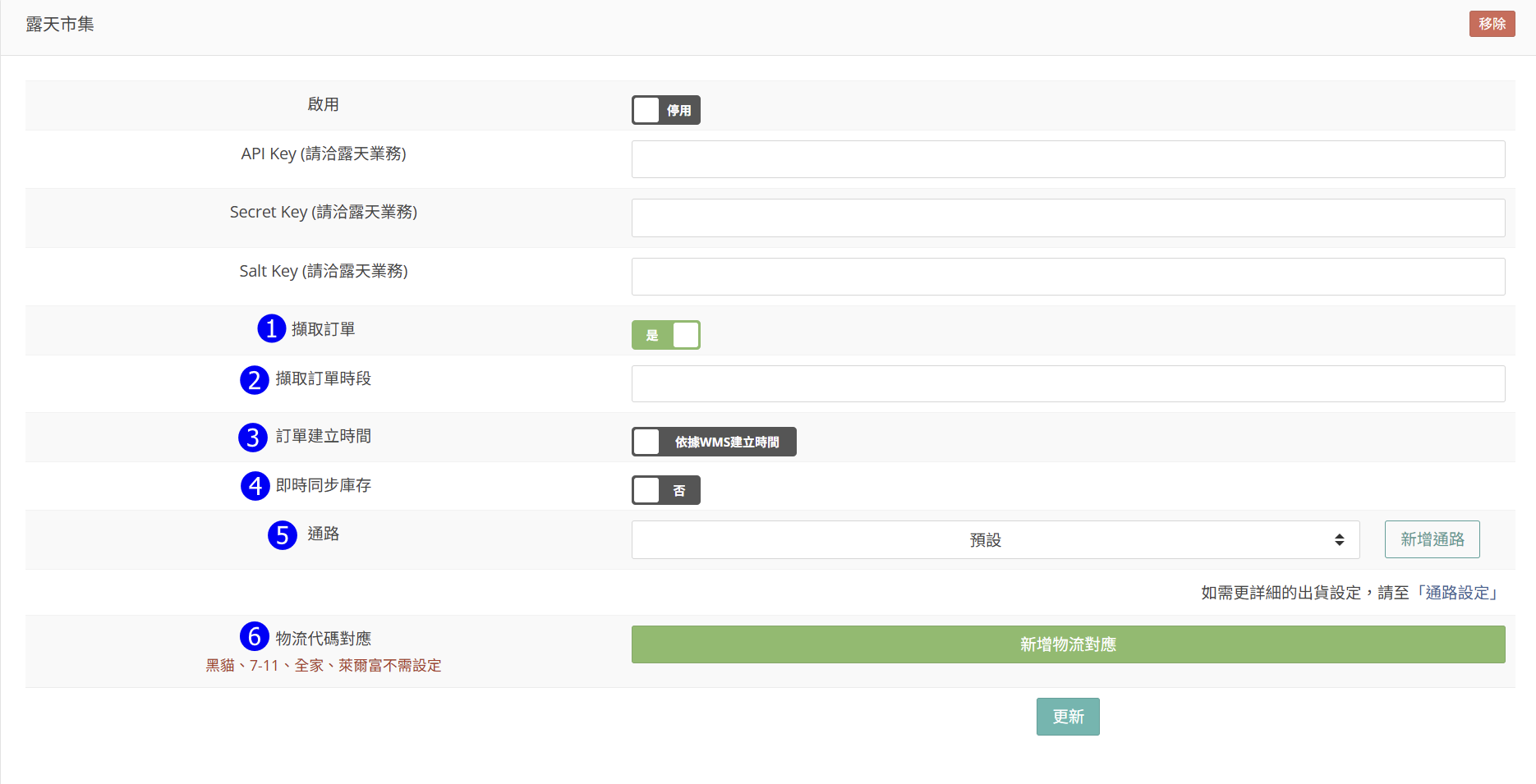 1、擷取訂單:調整為「是」,系統會將露天市集後台符合訂單狀態為「待確認」的訂單抓進 WMS 系統 ; 調整為「否」則不抓取露天市集訂單