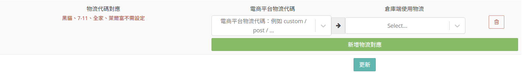 - (1.)在物流代碼對應欄位 點擊「新增物流對應」後,點擊「電商平台物流代碼」輸入電商平台物流代碼