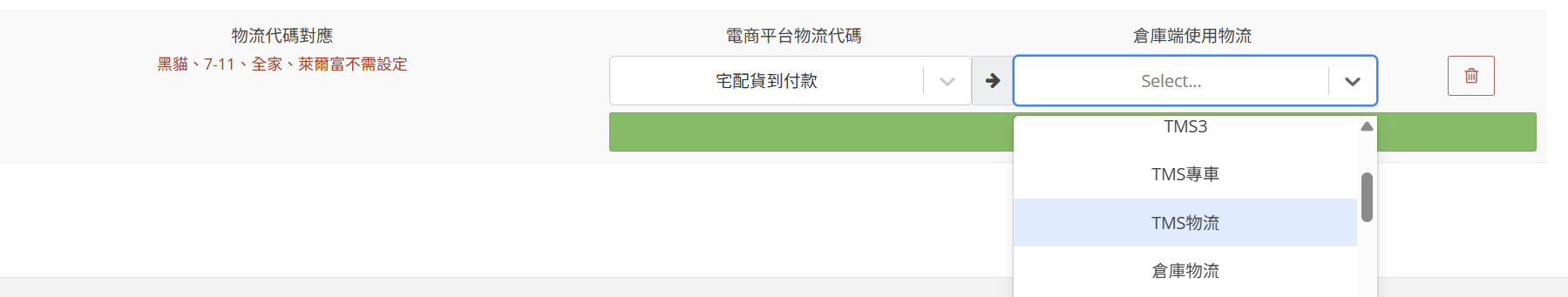 - (2.)接著點擊「倉庫端使用物流」,下拉選單會列出 WMS 後台提供的物流方式。