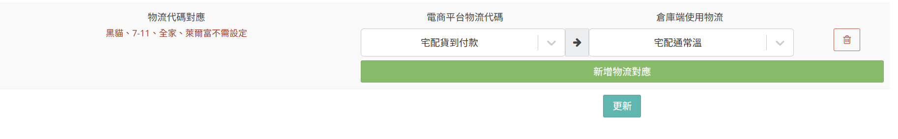 - (3.)以下圖為例代表,當訂單所選物流為「 宅配貨到付款」時,在 WMS 要使用「宅配通常溫」出貨,確認設定正確後點擊更新即可。