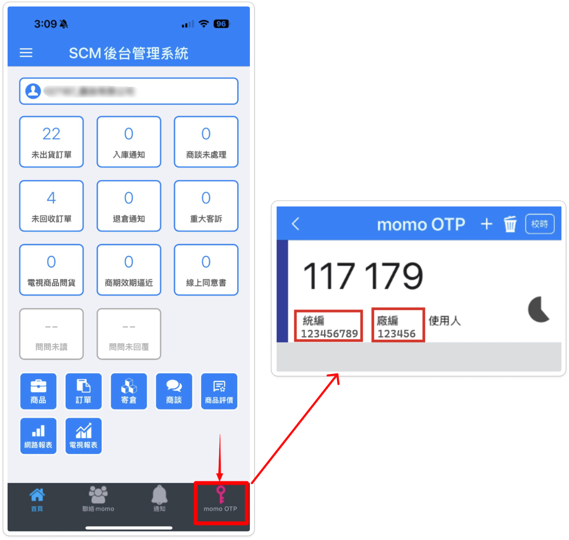 *「廠商統編」、「統一編號」可以在 APP- momo SCM 內 momo OTP 查詢到,下方為 APP- momo SCM 畫面