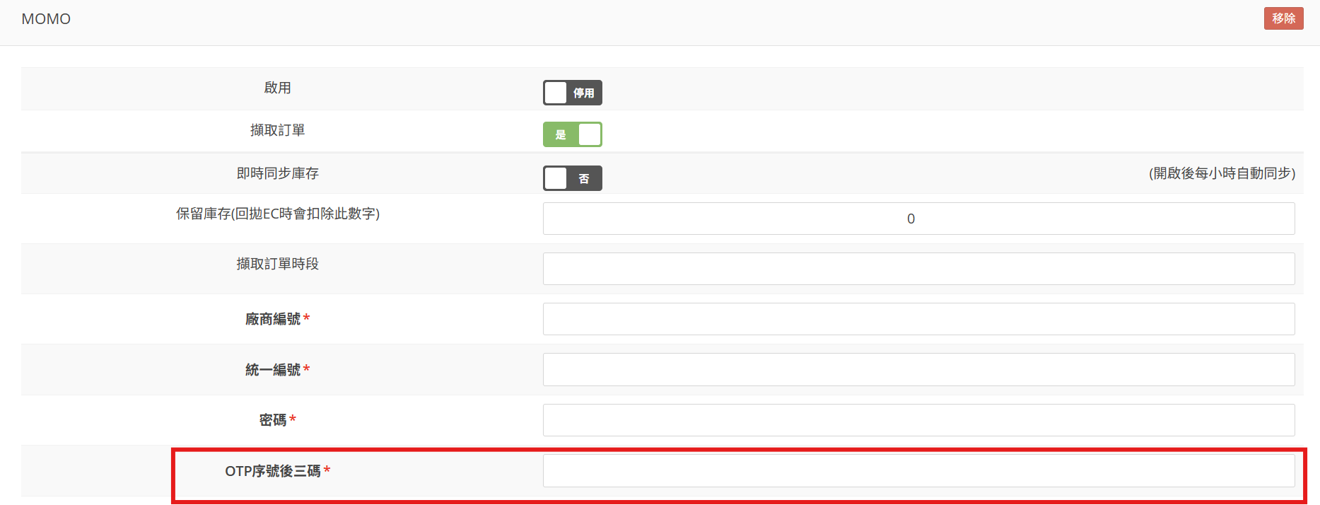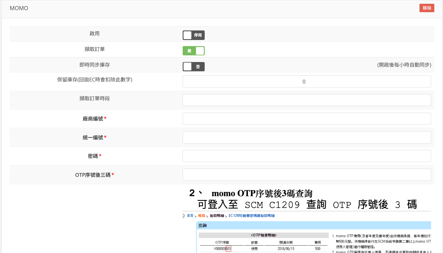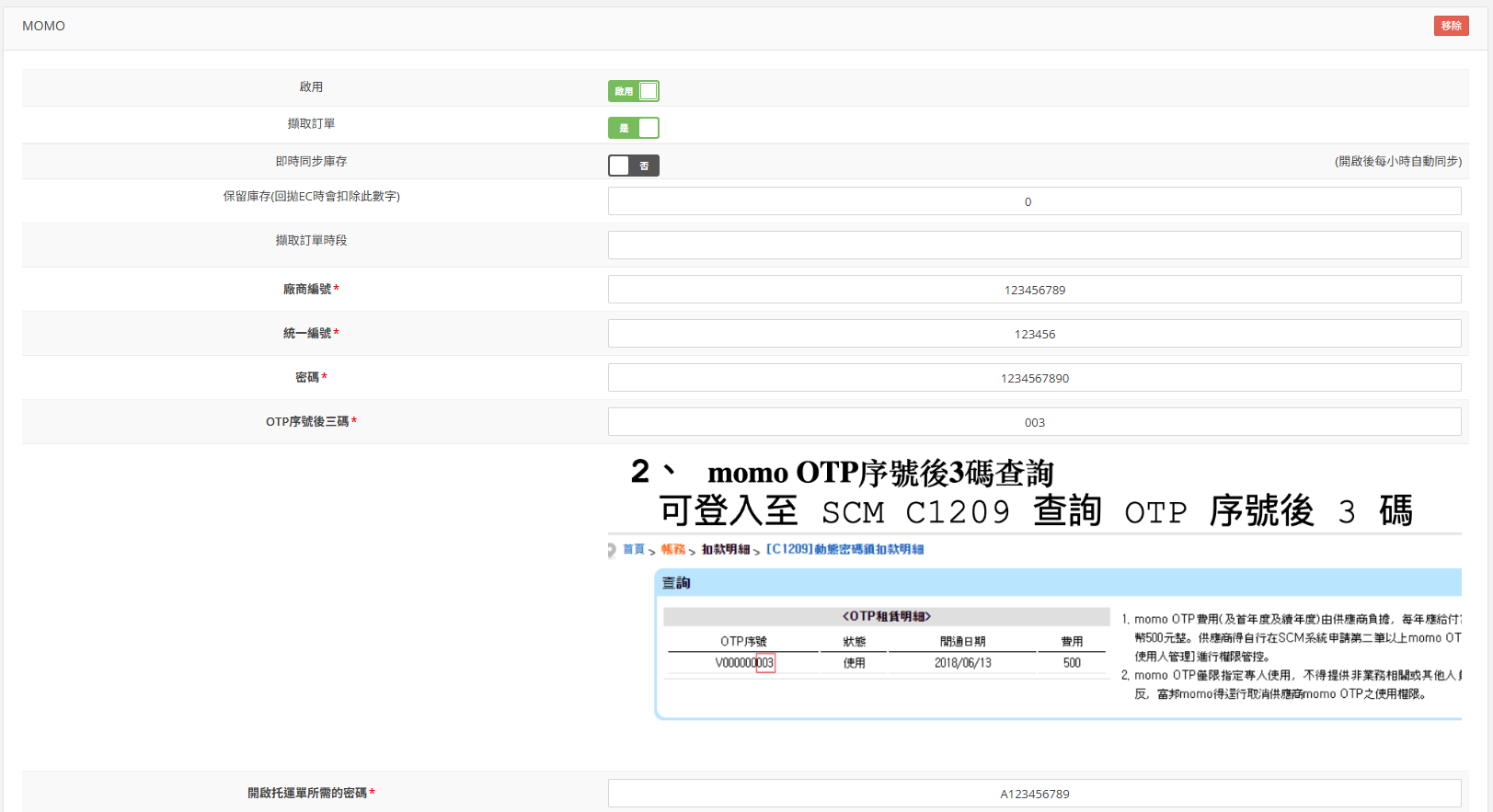 1、廠商編號:輸入 momo OTP 顯示的廠編