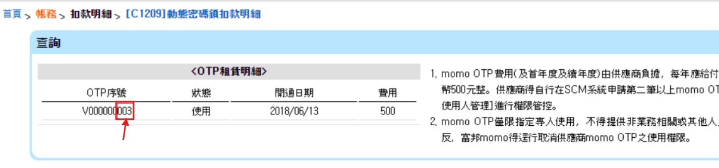 *「OTP 序號」可以在 momo 後台確認,momo 後台路徑:「[帳務]>[扣款明細]> [ C1209 ] 動態密碼鎖扣款明細」,下方為 momo 後台畫面