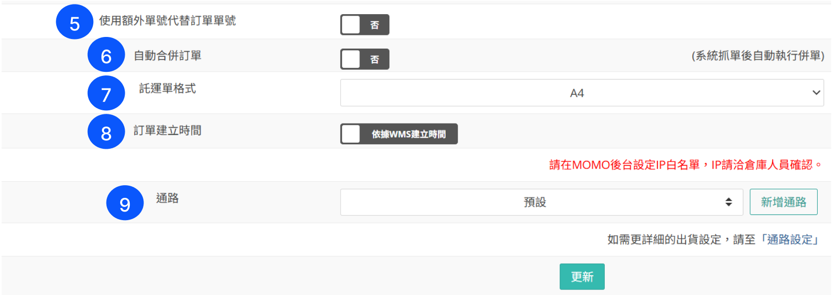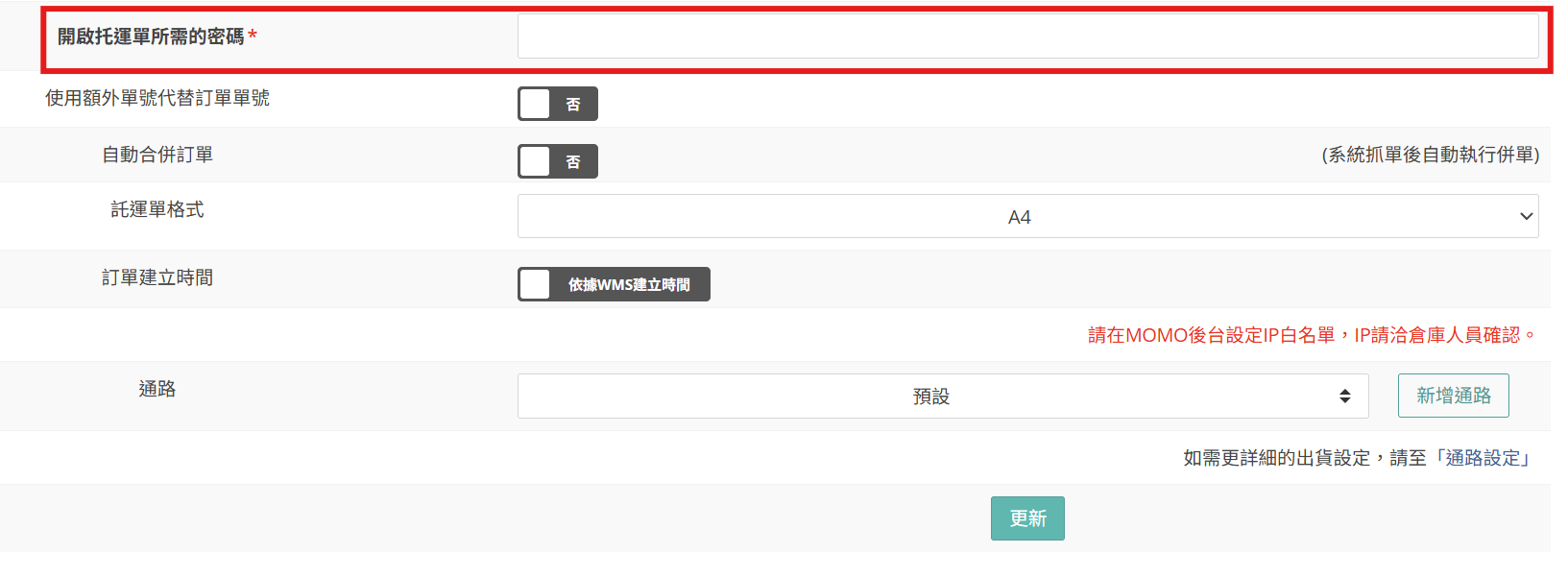 * WMS 無法抓取於 momo 後台執行併單動作的訂單,若有併單需求請打開此開關後,請勿於 momo 後台執行併單。