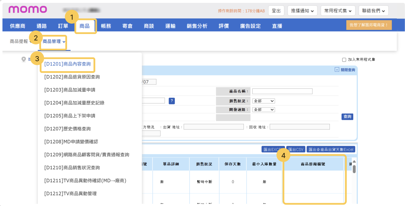 到「 momo 後台>商品>商品管理>[D1201]商品內容查詢」