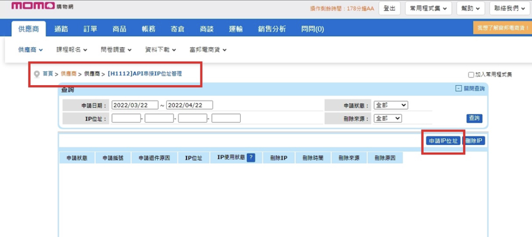 「momo 後台>[供應商]>[供應商]> 【H1112】API 串接 IP 位置管理> 申請 IP 位址」