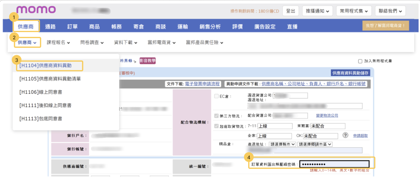 *「開啟托運單所需的密碼」可以在 momo 後台確認, momo 路徑:「[供應商]>[供應商]> [ H104 ] 供應商資料異動確認」,下方為 momo 後台畫面